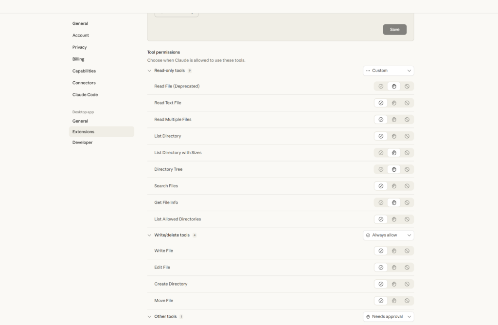 Pour l’activer, ouvrez Claude Desktop, allez dans les paramètres (icône en bas à gauche), puis dans la section « Integrations » ou « Extensions ». Vous trouverez le plugin Filesystem dans la liste. Activez-le, puis indiquez-lui le dossier auquel vous souhaitez lui donner accès. Dans mon cas, c’est mon vault Obsidian complet.