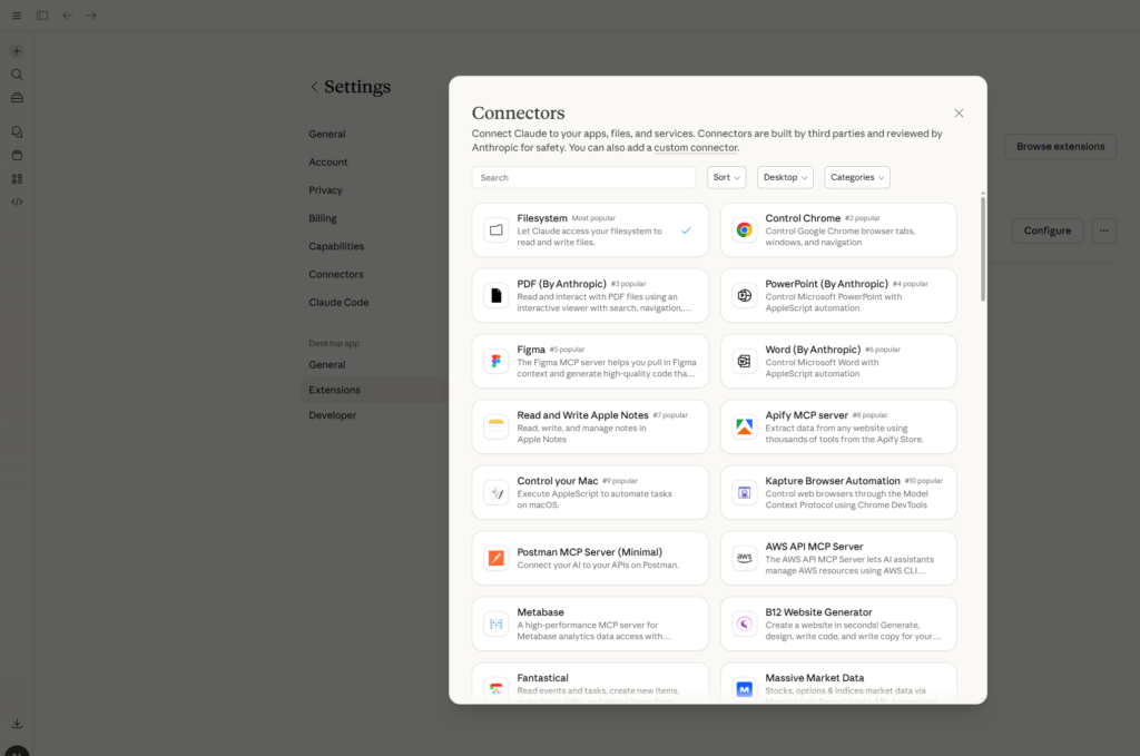 C’est l’étape clé. Le plugin Filesystem est une extension MCP qui permet à Claude Desktop de lire des fichiers sur votre ordinateur. C’est lui qui va permettre à Jarvis de consulter votre vault Obsidian, ou n’importe quel dossier de notes.