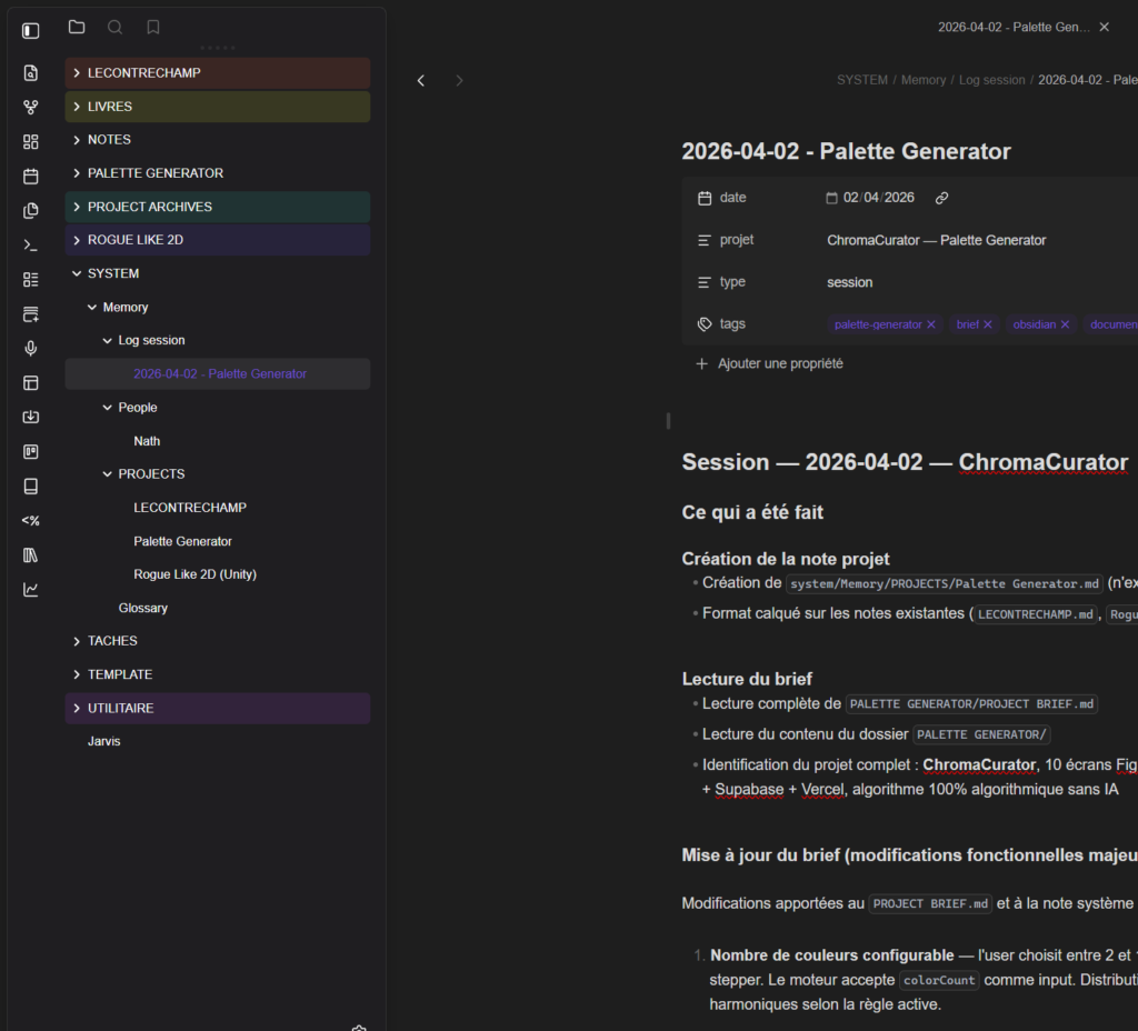 Concrètement : j’utilise Obsidian comme cerveau externalisé depuis un moment déjà (j’en avais parlé dans un article précédent). J’ai un dossier system/memory/ dans mon vault où je stocke des notes sur mes projets en cours, mes préférences, mon style de travail et des logs de sessions. Ce dossier, Claude peut le lire à chaque conversation.