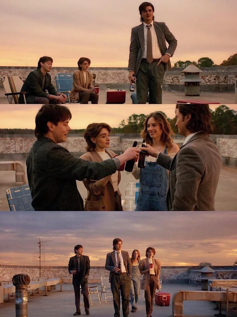 La scène avec nos babysitters préférés (Nancy, Jonathan, Steve et rockin’ Robin) m’a vraiment retourné. Ils discutent de leurs projets futurs respectifs tout en étant déjà nostalgiques de leur amitié. Ils finissent par créer une réunion mensuelle, mais je peux vous dire qu’en étant trentenaire (33 ans), ce genre de réunion ne dure guère dans le temps. Et vu comment ils sont en pleurs, eux non plus n’y croient pas vraiment. C’est l’un des moments les plus touchants de l’épisode, surtout que j’adorais le duo Robin et Steve.